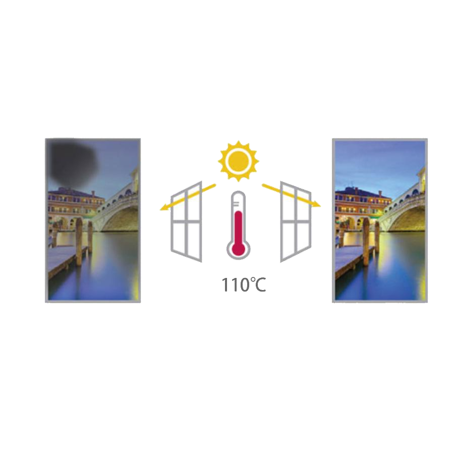 High TNI panelréteg 110°C-os felületi hőmérsékletig sem mutat kifehéredési hibát. Nélkülözhetetlen déli tájolású kirakatnál.